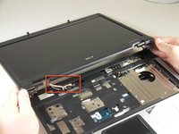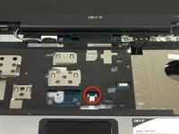 Release the catch on the ribbon socket, by sliding the two tabs toward the ribbon, then pull the ribbon, which is located under the keyboard, to detach it from the motherboard.
