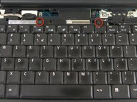 Under the panel, locate and remove the two screws that connect the keyboard to the laptop. One screw is located above the F5 button, and the other one is located above the F10 button.