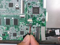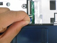 Using the blue tab, pull the trackpad ribbon cable from its socket on the motherboard.