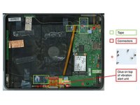 Now remove the two adhesives that hold down he display cable. Unplug the cable's two connectors and remove the display unit from the device.