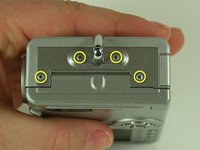 On the backside of the camera, remove the 3.5 mm screw that sits to the left of the viewfinder and above the LCD screen.