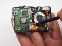 Remove the last screw holding the tripod mount to the case. The LCD ribbon threads under the mount, so upon reinstallation, the ribbon will need to be threaded through before the mount is reattached. Take note of the tripod mount orientation.