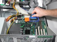 Disconnect the floppy drive drive ribbon cable by gently pulling the black tab away from the motherboard.