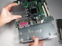 Grasp the heat sink with your left hand and the I/O port panel with your right hand and pull to separate motherboard from the metal base.