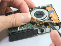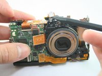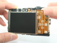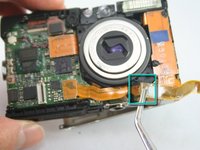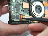 Use a spudger to lift the connector lock (black flap) at the end of the larger LCD connector ribbon on the front side of the camera.