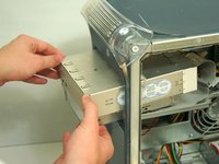 Pull the drive out to allow access to the power and ribbon cables. Do not fully remove.