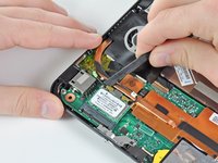 Carefully lift the heat sink off the face of the motherboard and de-route the curved section from next to the fan.