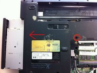 Remove the screw above the RAM access cover that holds the CD drive in place. Then, slide the drive to the left out of the case. Be careful not to pull the front off of the tray itself.