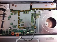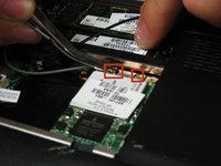 Use a pair of tweezers to disconnect both antennas from their sockets on the wireless card. These are snap-on connectors, so simply pull them straight up to snap them off the studs on the card.