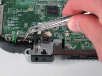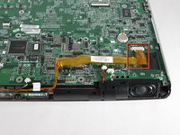 Using tweezers, remove the the rigth speaker cable - the cable set on the left with red and black wires - by pulling the white connector towards you.