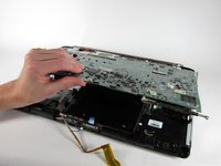 Pull on the black tab with the HP service sticker to unplug the display from the motherboard.