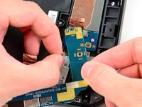 Use the attached black tab to pull the display data cable straight up and out of its socket on the motherboard.
