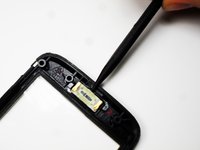Above the screen on the opposite, gently pry off the ear piece with the spudger.