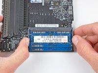 Release the tabs on each side of the RAM chip by simultaneously pushing each tab away from the RAM.