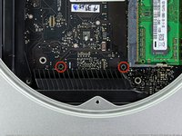 Remove the two 11.3 mm T6 Torx screws securing the fan to the logic board near the antenna plate.