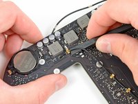 Use the flat end of a spudger to pry both antenna connectors up from their sockets on the AirPort/Bluetooth board.