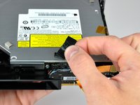 Use the tip of a spudger to remove the black electrical tape spanning the interconnect board and optical drive.
