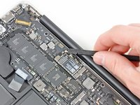 Grab the clear plastic pull tab attached to the battery connector and pull it toward the front edge of the Air to disconnect the battery from the logic board.