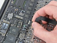 Grab the clear plastic pull tab attached to the battery connector and pull it toward the front edge of the Air to disconnect the battery from the logic board.