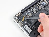 Grab the clear plastic pull tab attached to the battery connector and pull it toward the front edge of the Air to disconnect the battery from the logic board.