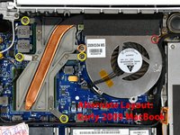 Use a spudger to move the gray display data and black speaker cables to the right. This will reveal a silver screw securing the fan housing to the lower case.