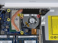 Use a spudger to move the gray display data and black speaker cables to the right. This will reveal a silver screw securing the fan housing to the lower case.