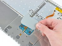 Gently peel up the section of the upper case cable stuck to the keyboard ribbon cable, being careful not to disturb the keyboard ribbon cable in the process.