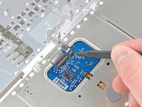 Use the flat end of a spudger to carefully peel up the adhesive around the perimeter of the plastic panel stuck to the underside of the trackpad.