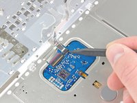 Use the flat end of a spudger to carefully peel up the adhesive around the perimeter of the plastic panel stuck to the underside of the trackpad.