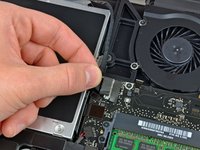 Grab the plastic pull tab secured to the display data cable lock and rotate it toward the DC-in side of the computer.