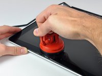 Pull up on the suction cup and use the flat end of a spudger to carefully pry the glass display panel out of the display assembly.
