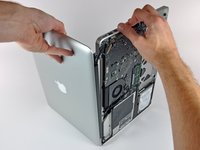 While holding the display and upper case together with your left hand, remove the remaining 6.5 mm Torx screw from the lower display bracket.