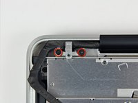 Remove the outer two T6 Torx screws securing both display hinges to the upper case (four screws total).