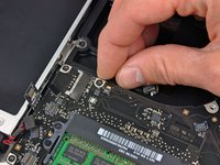 Remove the two 5 mm Phillips screws securing the left speaker to the logic board assembly.