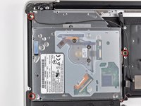 Carefully peel the battery warning label off the upper case between the battery and the optical drive to reveal an additional Tri-wing screw.