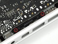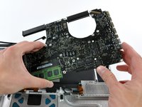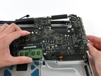 Carefully lift the logic board assembly from the left side and work it out of the upper case, minding the port side that may get caught during removal.