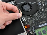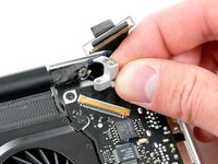 Grab the plastic pull tab secured to the LVDS cable lock and rotate it toward the DC-in side of the computer.