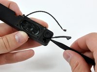 Deroute the microphone cable from the channel in the left speaker and use the tip of a spudger to dislodge the microphone from its housing within the left speaker.