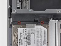 Remove the two Phillips screws securing the hard drive bracket to the upper case.
