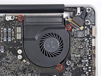 Remove the three T6 Torx screws securing the left fan to the logic board.