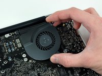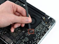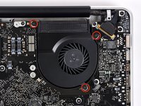 Remove three T6 Torx screws securing the left fan to the logic board.