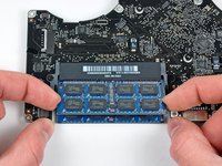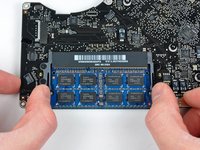 Release the tabs on each side of the RAM chip by simultaneously pushing each tab away from the chip.