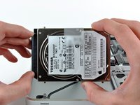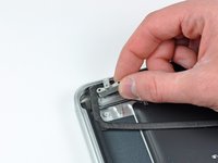 Carefully peel the hard drive cable off the adhesive securing it to the right speaker housing.