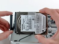 Remove the two Phillips screws securing the hard drive bracket to the upper case.