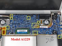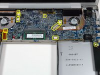 If the right speaker assembly remains attached to the logic board, hold the logic board with one hand and slide the speaker up slightly to free it from the logic board.