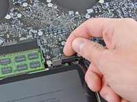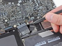 Carefully pull the ports and DC-In board away from the side of the upper case and remove the logic board assembly, minding any cables that may get caught.