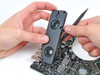 Use the flat end of a spudger to lift the subwoofer & right speaker connector out of its socket on the logic board.