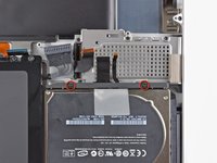 Remove the two 2.2 mm Phillips screws securing the hard drive cable to the upper case.