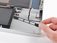 Lift the black plastic flap attached to the display data cable retainer and rotate it toward the DC-In side of the MacBook.