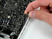 Grab the plastic pull tab secured to the display data cable lock and rotate it toward the DC-in side of the computer.